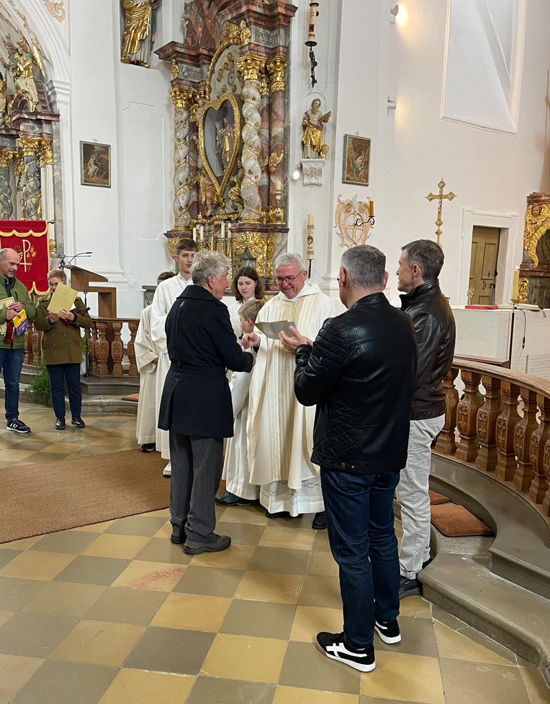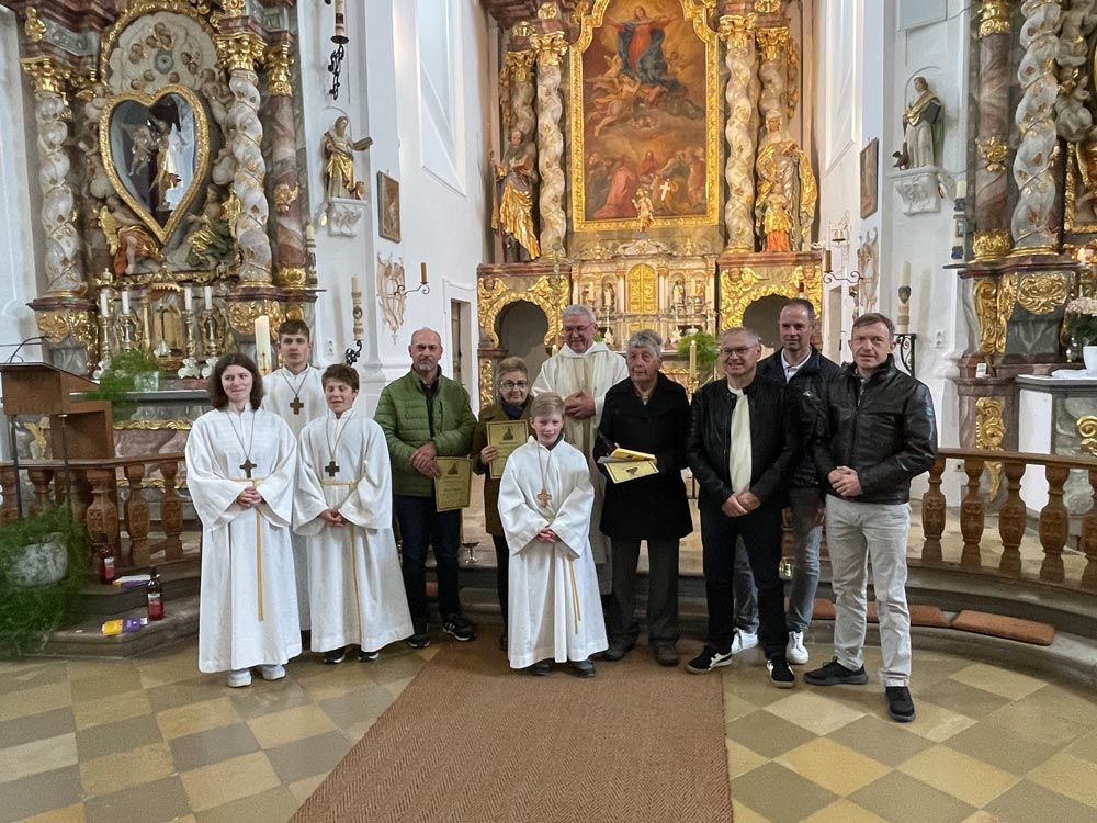 Am Sonntag vor „Christi Himmelfahrt“ wurden in der Wallfahrtskirche „Mariä Namen“ drei Mitglieder der Kirchenverwaltung verabschiedet: Kirchenpfleger Martin Kurzendorfer, Eveline Igl-Kraus und Xaver Stigler hatten von 2019 bis 2024 das Vermögen und die Gebäude der Kirchenstiftung Trautmannshofen verwaltet. Der neue Kirchenpfleger Stefan Lang dankte auch der nach acht Jahren ausgeschiedenen Mesnerin und ehemaligen Dekantsratsvorsitzenden Ida Hollweck. Es sei immer ein Zusammenwirken von vielen Zahnrädern, um Gotteshaus und kirchliches Leben zu erhalten. Neu in die Ministrantenschar aufgenommen wurde von Pfarrer Gerhard Ehrl bei diesem Gottesdienst zudem Jakob Heim.
