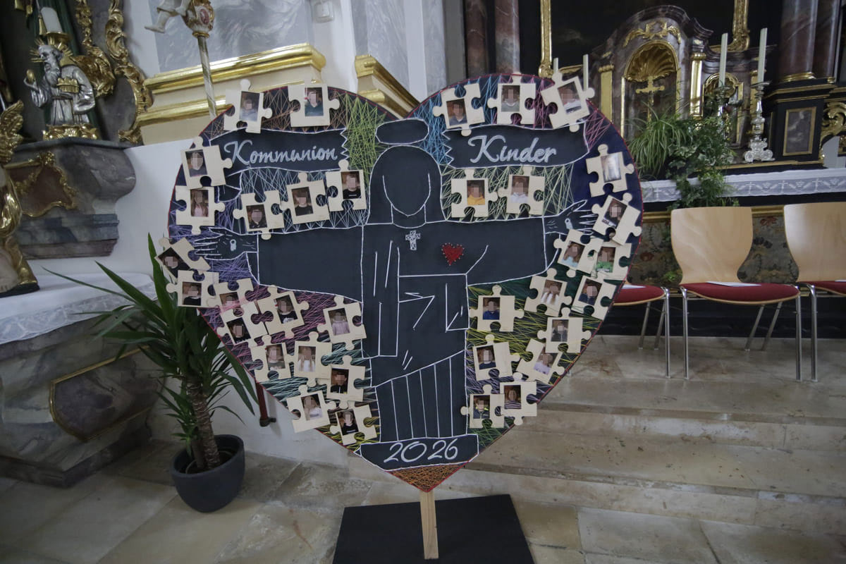 Im Pfarrverband an der Lauterachquelle empfingen am „Weißen Sonntag“ 16 Mädchen und 18 Jungen aus den Händen von Pfarrer Gerhard Ehrl und Kolping-Landespräses Christoph Wittmann die heilige Kommunion. Die Messe, die musikalisch von den „Troubadours“ aus Lauterhofen gestaltet wurde, hatte die Aussage Jesu „Ihr seid meine Freunde“ aus dem Johannesevangelium zum Motto. Die Eltern hatten ein großes Herz und ein Kreuz aus Puzzles mit den Namen der Kinder gefertigt. In der Predigt beschrieb Pfarrer Gerhard Ehrl das Wesen der Freundschaft anhand von Beispielen aus dem Neuen Testament. Jesus biete den Menschen seine Freundschaft an. Während menschliche Freundschaften auch zerbrechen könnten, kündige der Herr seine Treue nie auf. Der Geistliche dankte auch den Müttern, die seit Dezember die Kinder in Gruppenstunden auf den festlichen Tag vorbereitet hatten. Einige Kinder sind bereits voller Begeisterung als Ministranten im Pfarrverband tätig. Alle beteiligen sich an den Fronleichnamsprozessionen und den Maiandachten in den Pfarreien Lauterhofen, Trautmannshofen, Traunfeld und Gebertshofen. Foto: Thomas Sippl