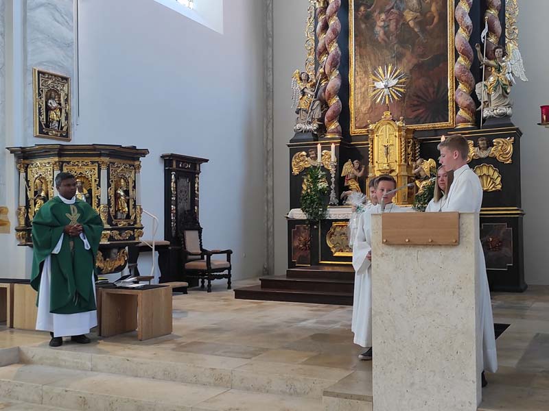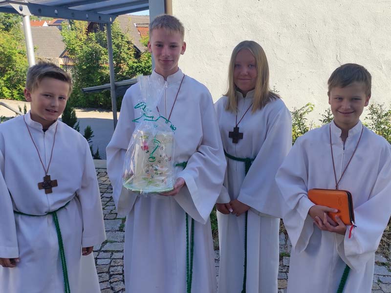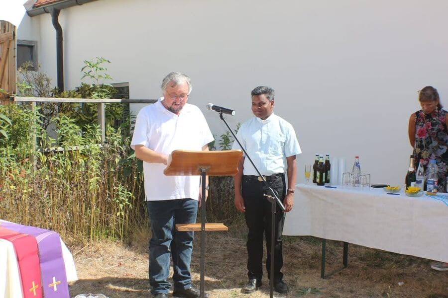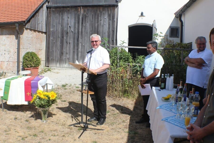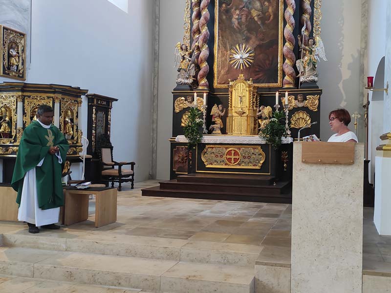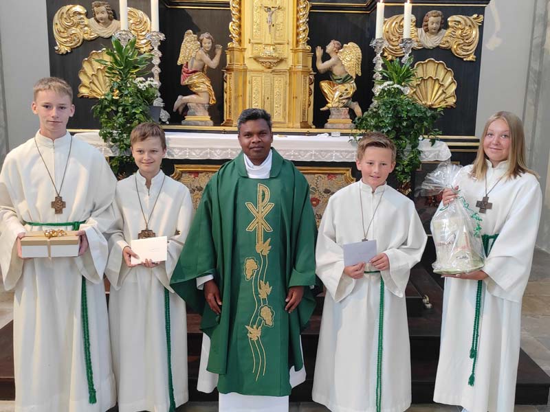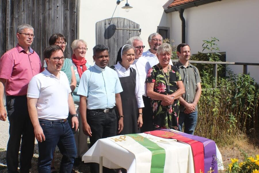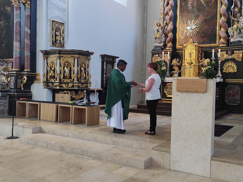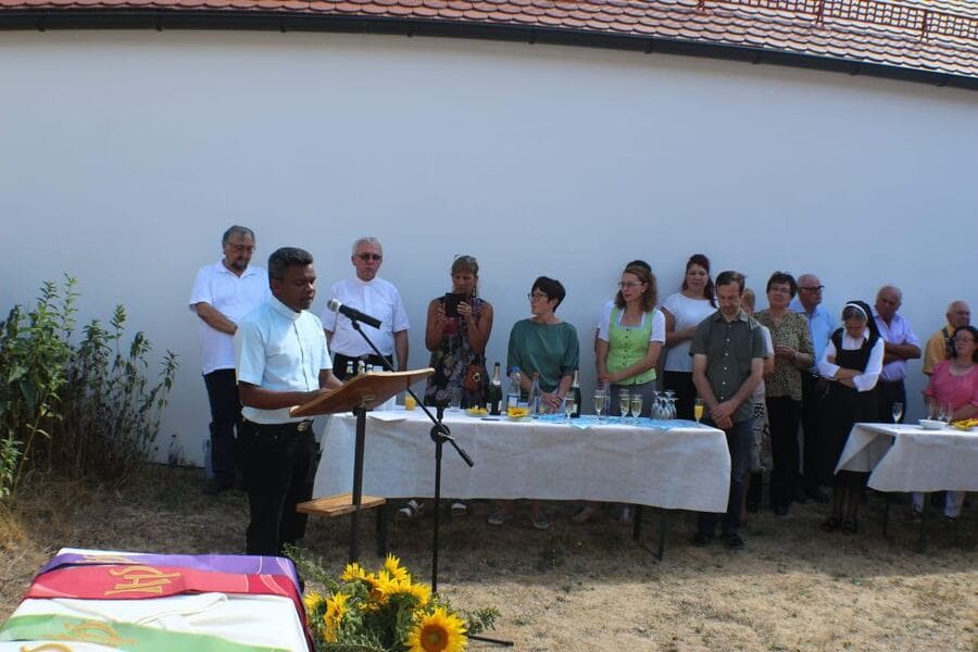 Nach 7 Jahren seelsorgerlicher Tätigkeit in den Pfarreien Lauterhofen, Traunfeld und Trautmannshofen nahm Kaplan P. Sunil Ekka am 14. August 2022 Abschied. Nach dem Festgottesdienst in der Traunfelder Pfarrkirche sprach ihm bei einem Stehempfang im Pfarrgarten Josef Bayerl, der Sprecher des Pfarrverbands, den gemeinsam Dank aller Gremien und Gruppen des Pfarrverbands Lauterhofen aus. Gemeinsam mit Pfarrer Gerhard Ehrl sowie den Kirchenpflegern und Pfarrgemeinderatsvorsitzenden überreichte er dem sichtlich gerührten Kaplan eine Albe mit 4 Stolen, ein Geschenk der Ordensschwestern vom Karlshof sowie der Kolpingfamilie Lauterhofen und mehrerer Privatpersonen. In seinen Dankesworten ging Kaplan P. Sunil auf die wertvollen Erfahrungen ein, die er unter anderem in der Regens-Wagner-Stiftung, in der Einzelseelsorge und gerade auch in den kleinen Filialgemeinden machen durfte. Pfarrer Gerhard Ehrl überbrachte auch den Dank von Dekan Elmar Spöttle und wünschte dem Kaplan Gottes Segen für seinen Einsatzort Seubersdorf, auch im Dekanat Habsberg gelegen.