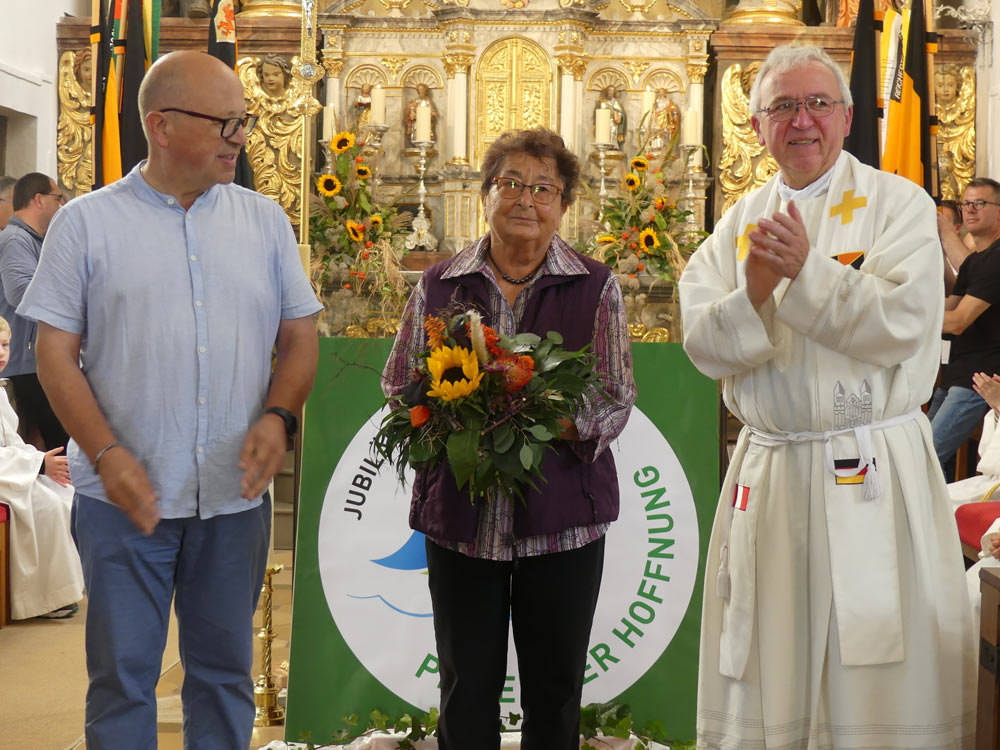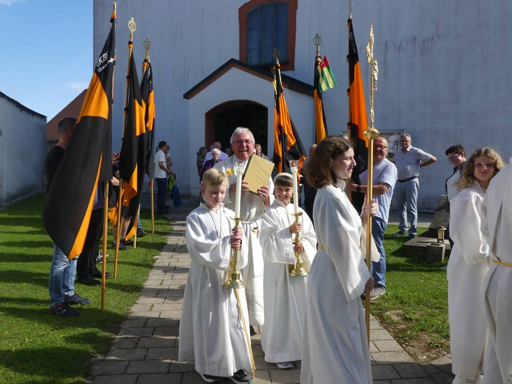 Unter den Klängen der „Troubadours“ aus Lauterhofen zogen die Bannerträger aus der gut gefüllten Kirche aus. Dabei wurden die Verse des Kolpinglieds angestimmt: „Wir sind Kolping und wir sehen das, was wirklich zählt.“ Vorher bedankte sich noch Bezirksvorsitzender Peter Nießlbeck bei der aus der Vorstandschaft ausscheidenden Christa Pietsch aus Neukirchen, dem Vorbereitungsteam, den Ministranten und Mesnerinnen, sowie den Chor „Troubadours“ Zugleich lud er zur Altkleidersammlung der Kolpingfamilien am 4. Oktober und zur Feier des 125jährigen Jubiläums der Kolpingfamilie Lauterhofen ein. Beim anschließenden Mittagessen äußerten einige schon ihre Vorfreude auf die 50. Bezirkswallfahrt am 20. September 2026 mit dem Bundespräses und dem Chor „MixDur“ aus Kastl.