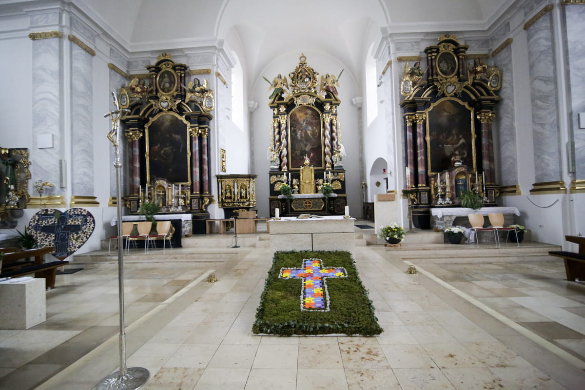 Im Pfarrverband an der Lauterachquelle empfingen am „Weißen Sonntag“ 16 Mädchen und 18 Jungen aus den Händen von Pfarrer Gerhard Ehrl und Kolping-Landespräses Christoph Wittmann die heilige Kommunion. Die Messe, die musikalisch von den „Troubadours“ aus Lauterhofen gestaltet wurde, hatte die Aussage Jesu „Ihr seid meine Freunde“ aus dem Johannesevangelium zum Motto. Die Eltern hatten ein großes Herz und ein Kreuz aus Puzzles mit den Namen der Kinder gefertigt. In der Predigt beschrieb Pfarrer Gerhard Ehrl das Wesen der Freundschaft anhand von Beispielen aus dem Neuen Testament. Jesus biete den Menschen seine Freundschaft an. Während menschliche Freundschaften auch zerbrechen könnten, kündige der Herr seine Treue nie auf. Der Geistliche dankte auch den Müttern, die seit Dezember die Kinder in Gruppenstunden auf den festlichen Tag vorbereitet hatten. Einige Kinder sind bereits voller Begeisterung als Ministranten im Pfarrverband tätig. Alle beteiligen sich an den Fronleichnamsprozessionen und den Maiandachten in den Pfarreien Lauterhofen, Trautmannshofen, Traunfeld und Gebertshofen. Foto: Thomas Sippl